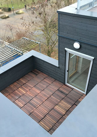 Afin de diminuer son entretien, le bardage brut de sciage a été peint avec du Falun Noir.
